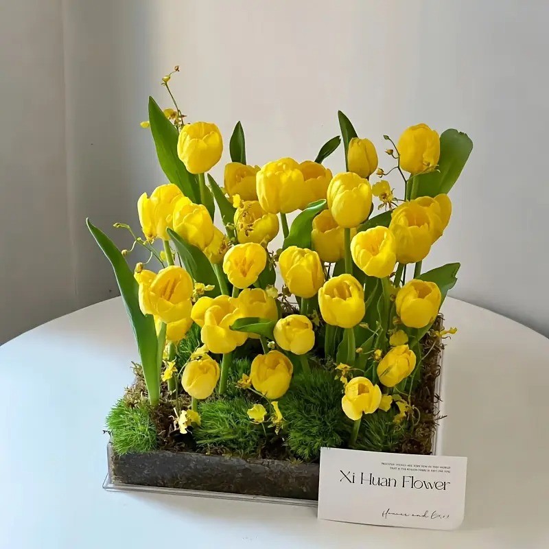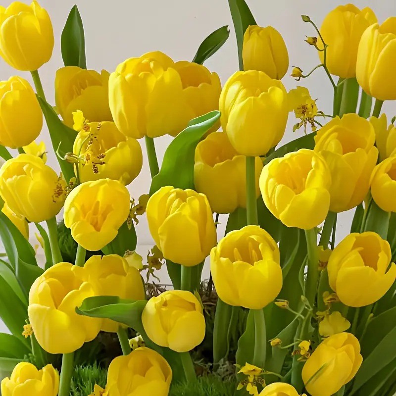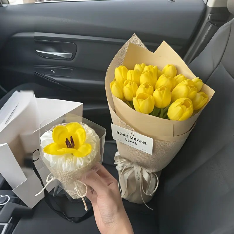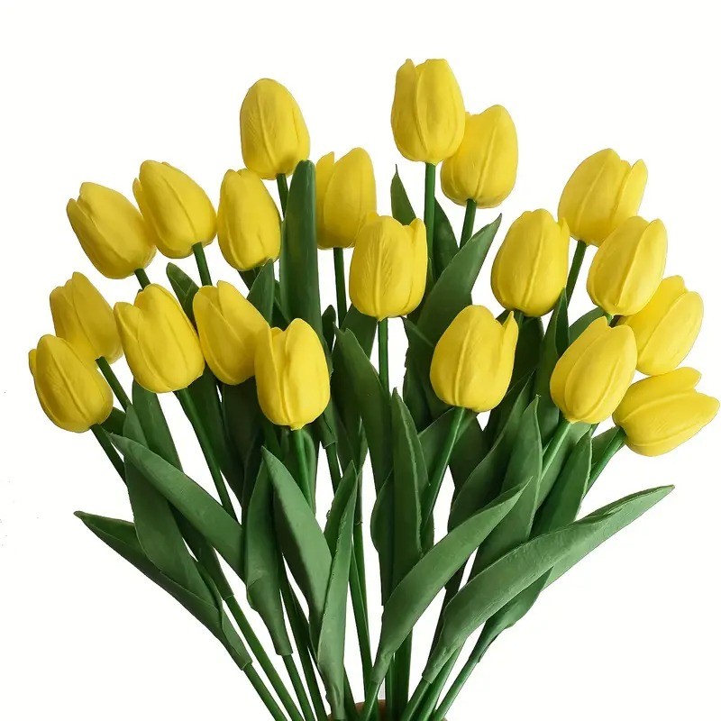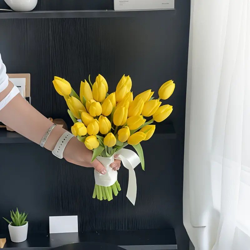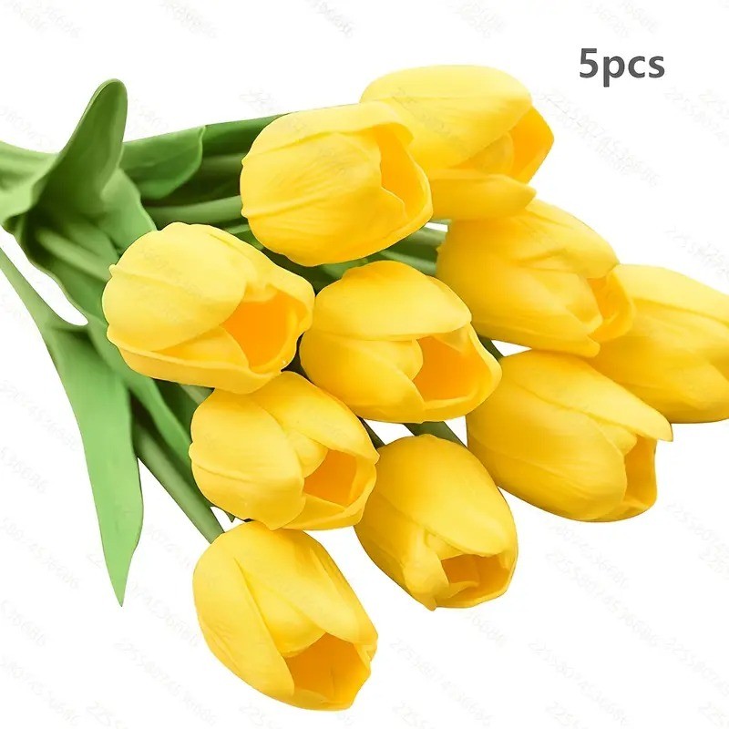 5 pc Premium Artificial Tulip Bouquet Realistic Yellow & Green Faux